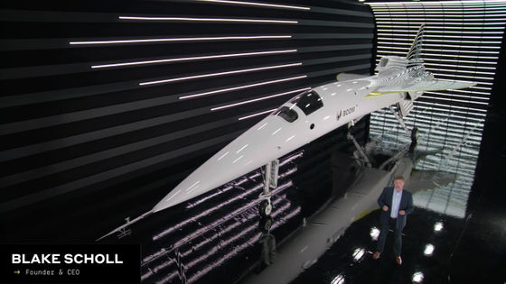 이것이 XB-1의 기체이고, 옆에 있는 것은 Boom의 창설자 겸 CEO인 Blake Scholl입니다.